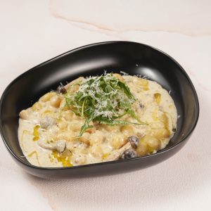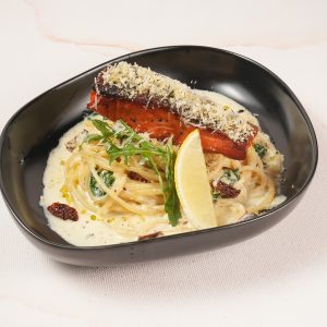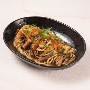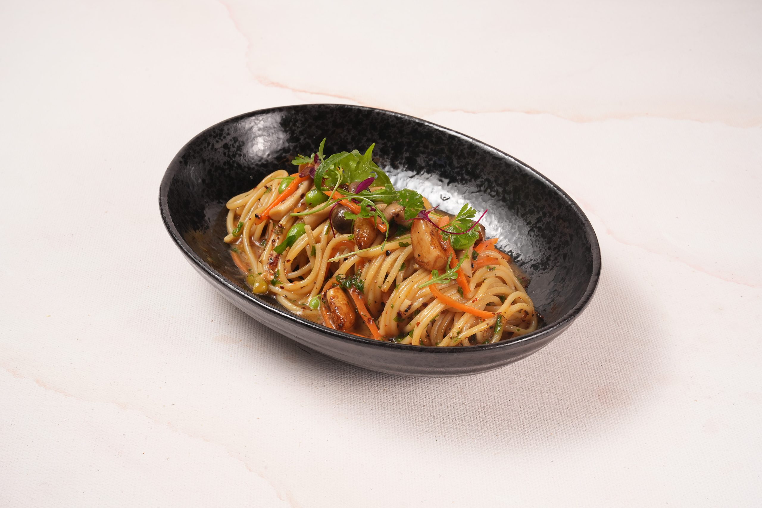 Spaghetti with garlic, olive oil, chilli flakes, carrots and button mushrooms