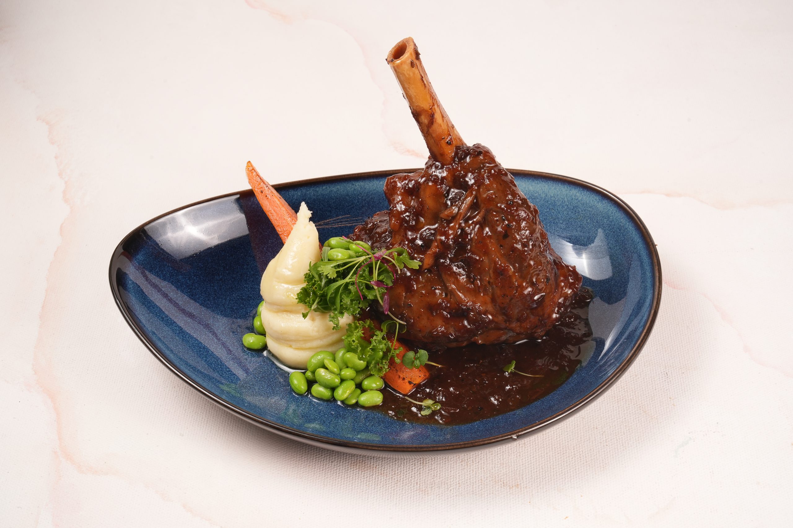 Grilled lamb steaks served with, Parmigiano mashed potato, roast honey carrot, buttered edamame, kale with a drizzle of honey balsamic vinaigrette, and served with BBQ sauce