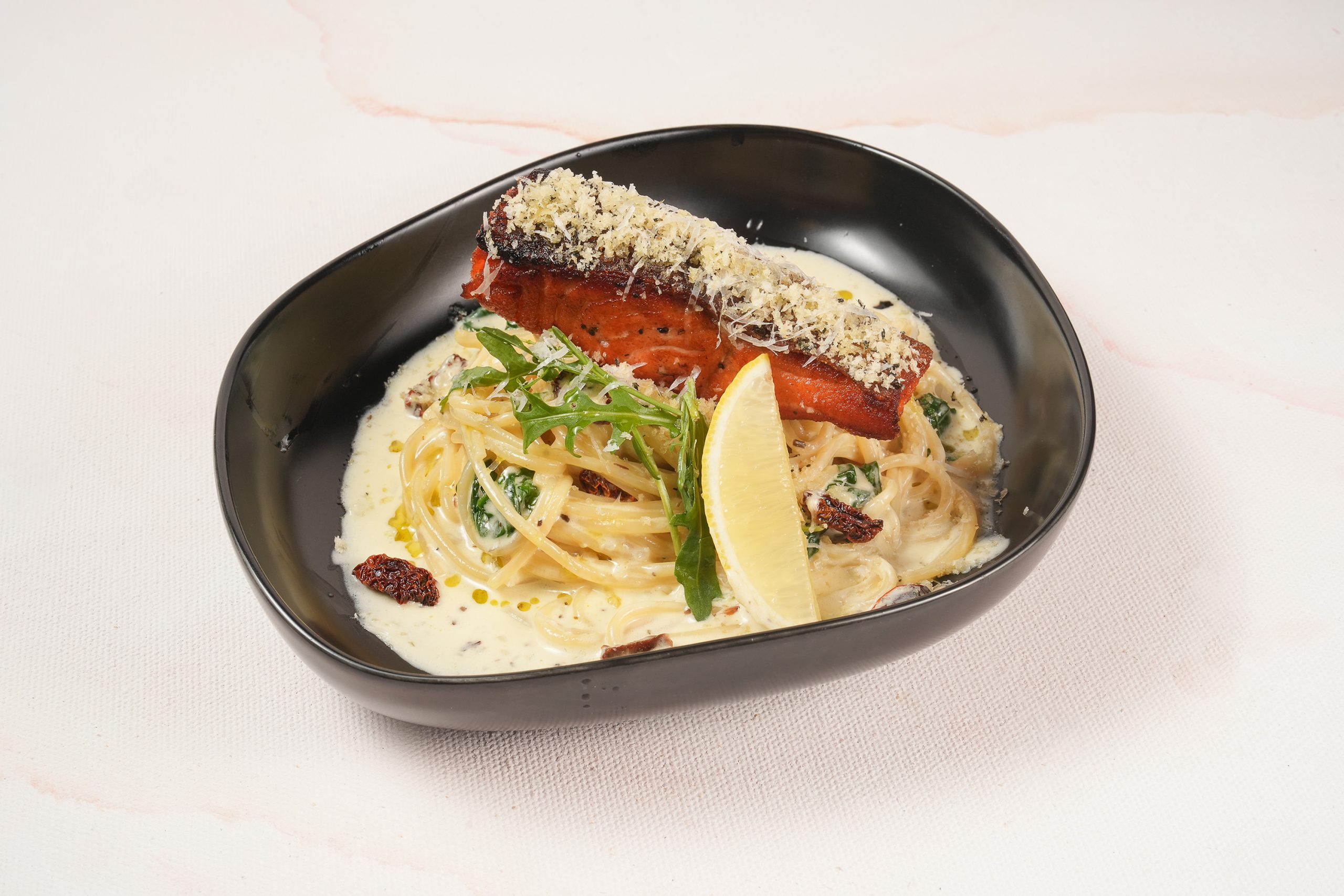 Tender and flaky roast salmon fillet tops this salmon spinach pasta that has a rich, cheesy & Parmigiano infuse sauce