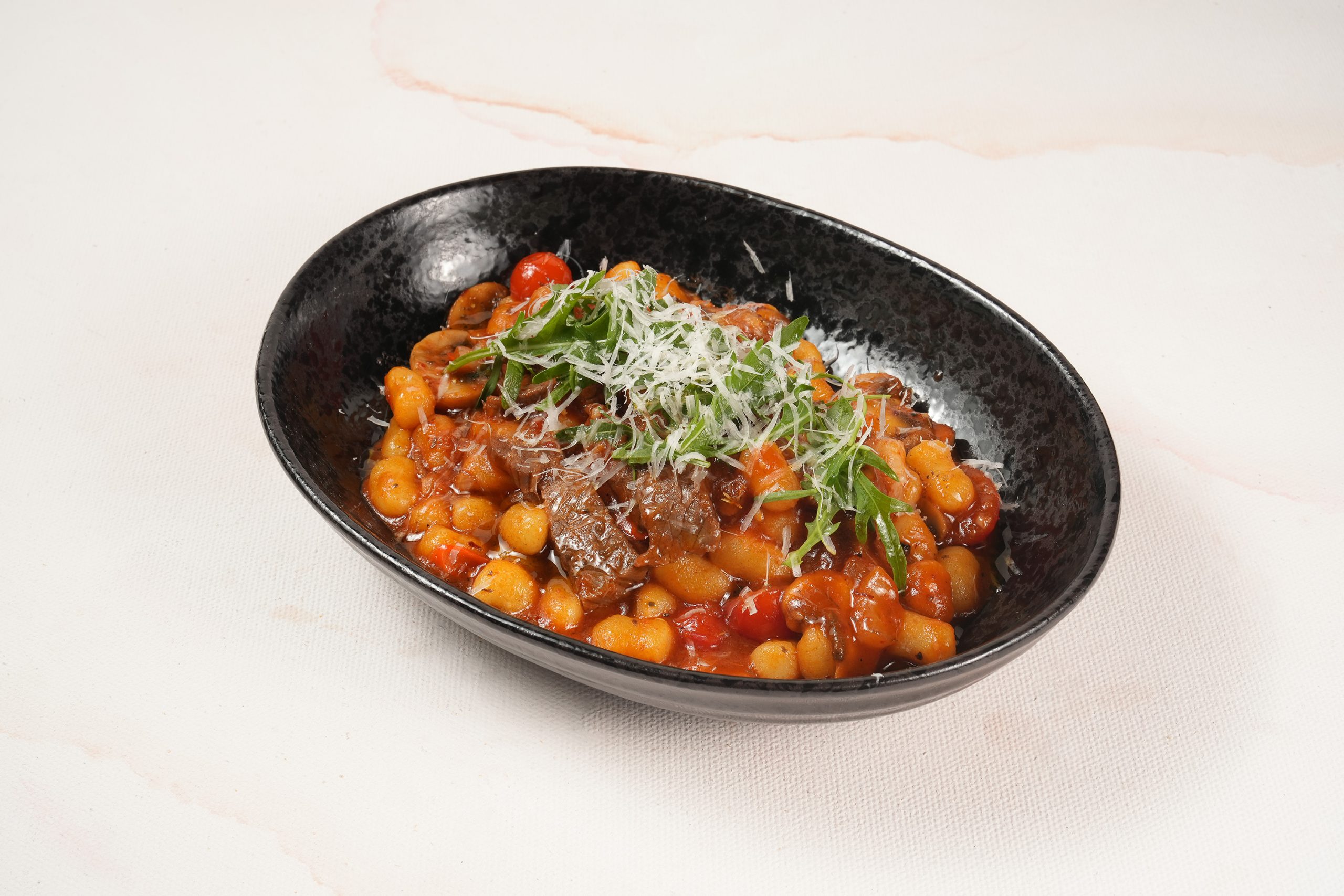 Soft, pillowy gnocchi tossed in a hot & spicy tomato sauce with sliced Wagyu salt beef, cherry tomatoes, fresh shimeji mushrooms, wild rocket arugula, grated Parmigiano, and a drizzle of basil oil