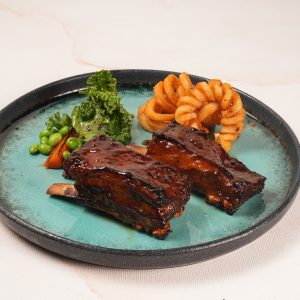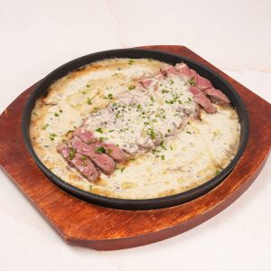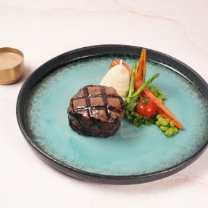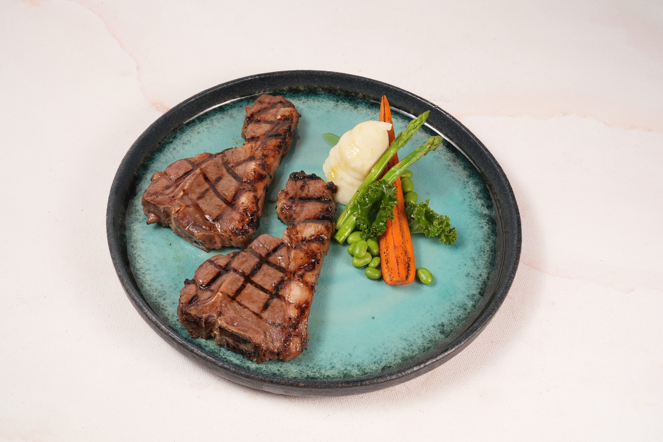 Grilled lamb steaks served with, Parmigiano mashed potatoes, roast honey carrot, buttered edamame, kale with a drizzle of honey balsamic vinaigrette, and served with selected sauce