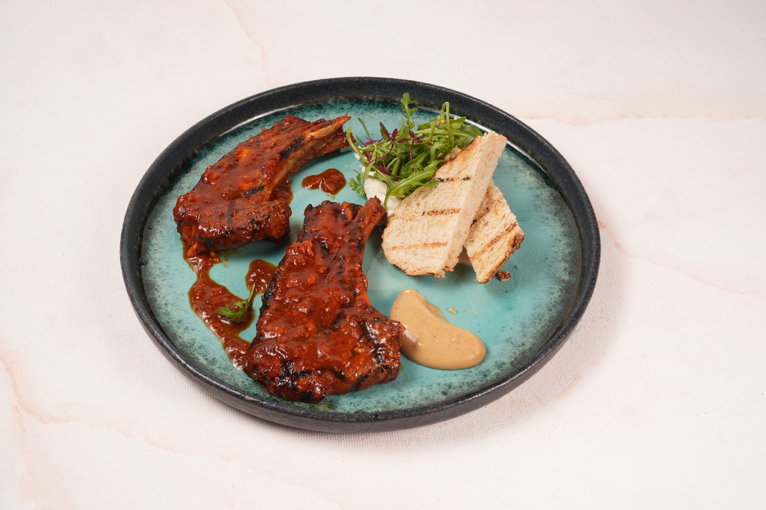 Grilled lamb rack served with rich Singapore-style Tulang Merah sauce, smooth garlic purée, fluffy Syrian hummus and sourdough bread to soak up all the flavours