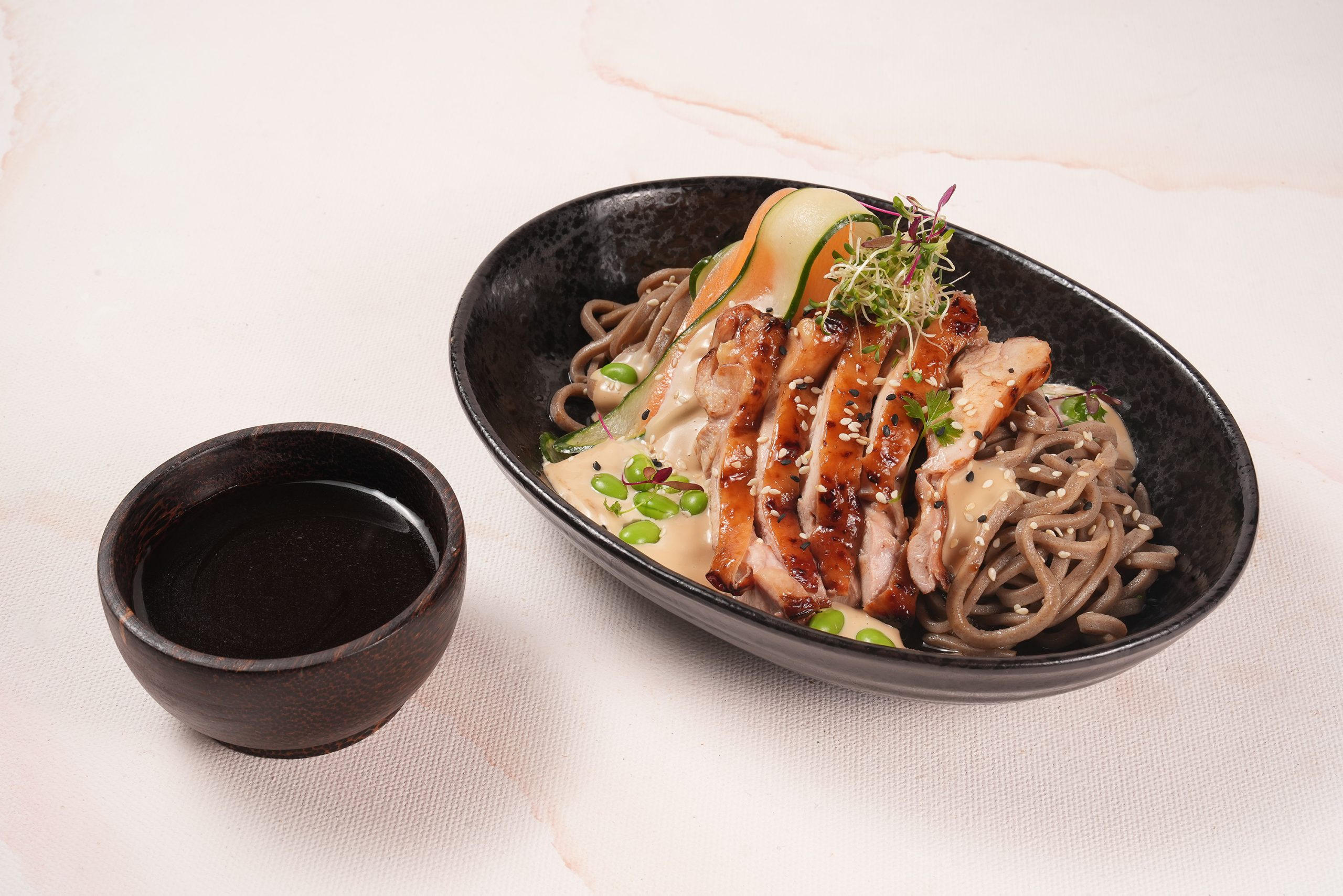 Chilled soba noodles served with teriyaki boneless chicken chop, edamame, carrot,