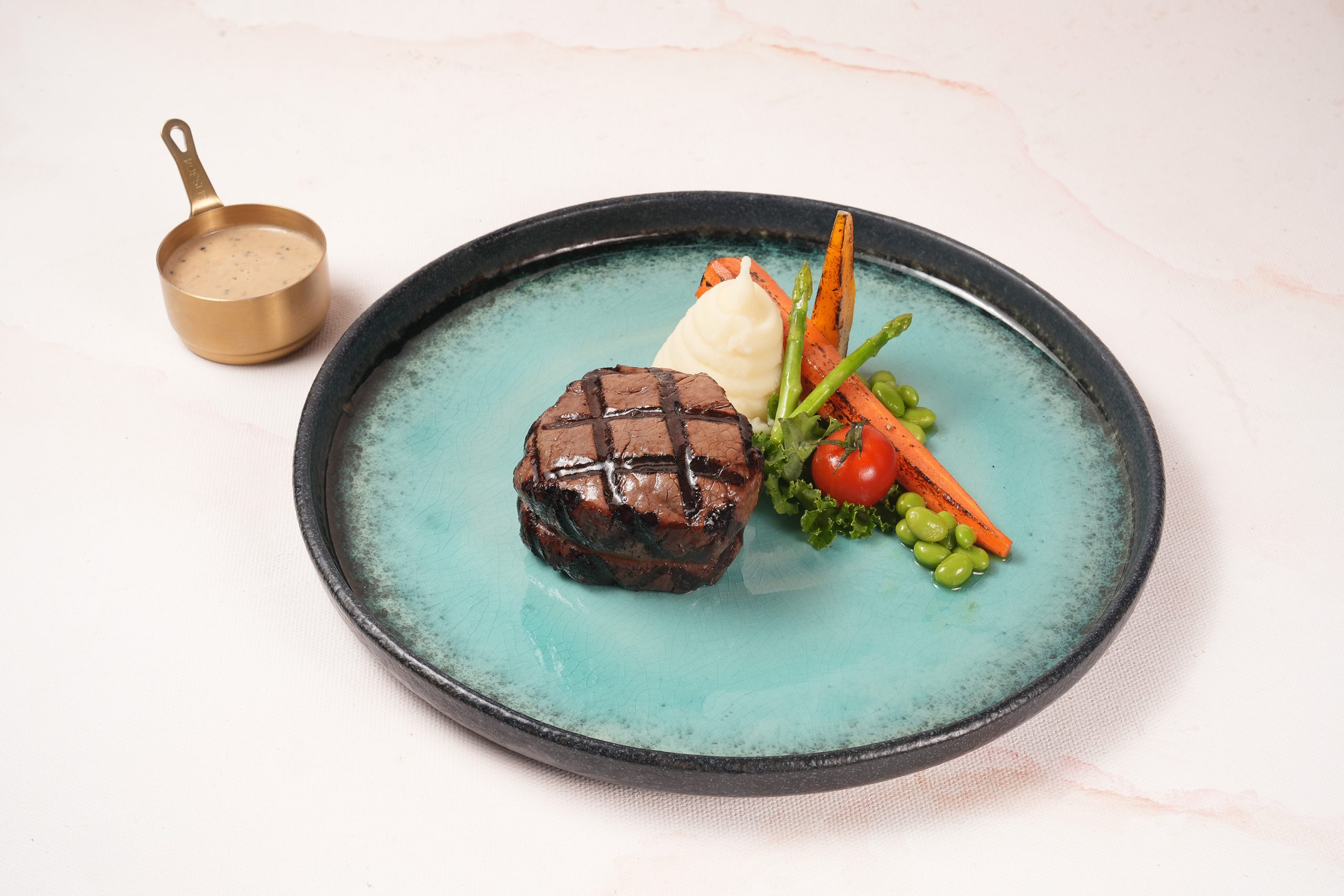 Grain-fed tenderloin steak served with Diane sauce, homemade mashed potatoes and roasted vegetables