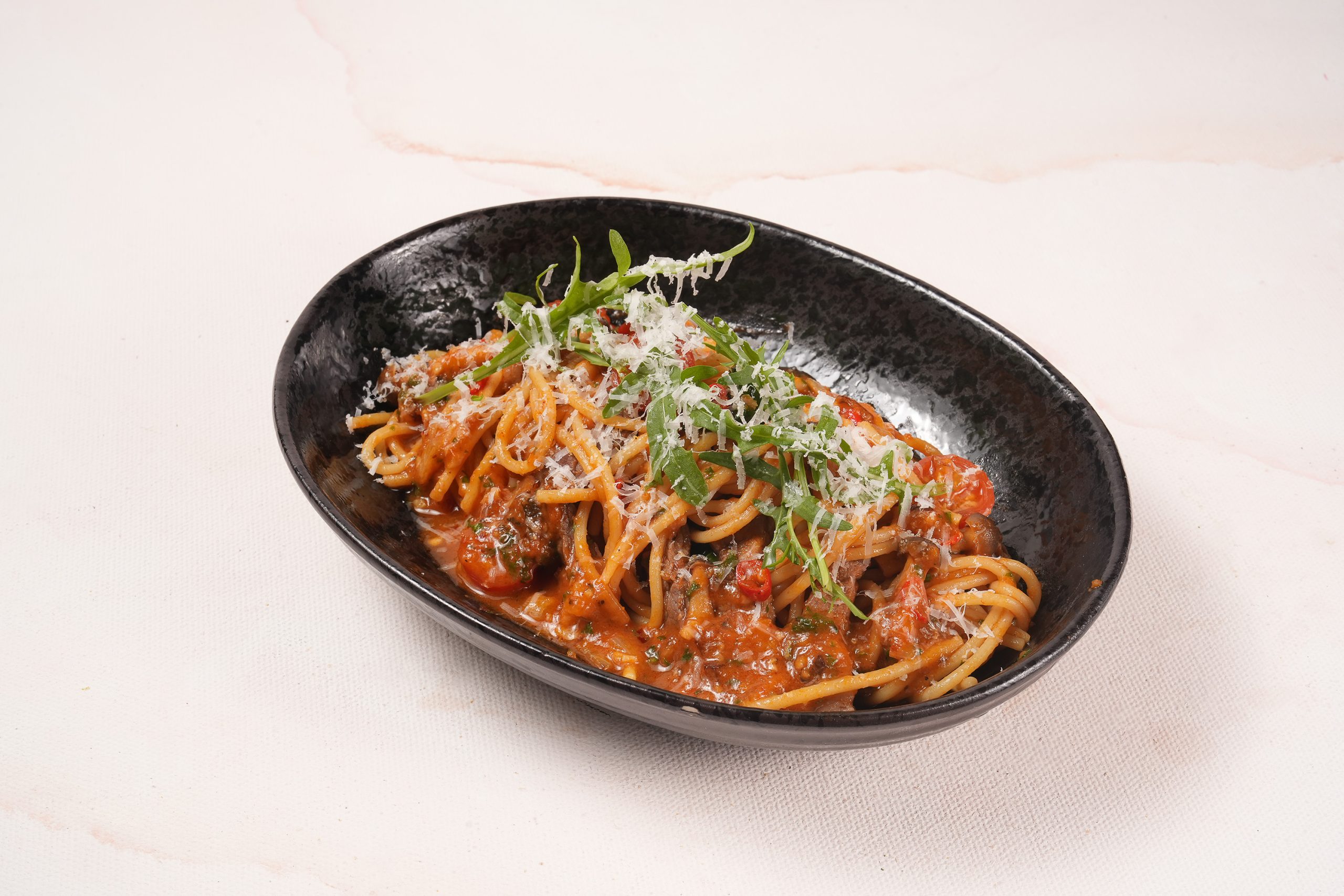 Spaghetti in spicy tomato sauce with Wagyu salt beef, mushrooms, cherry tomatoes, arugula, parmesan, and basil oil