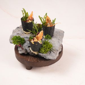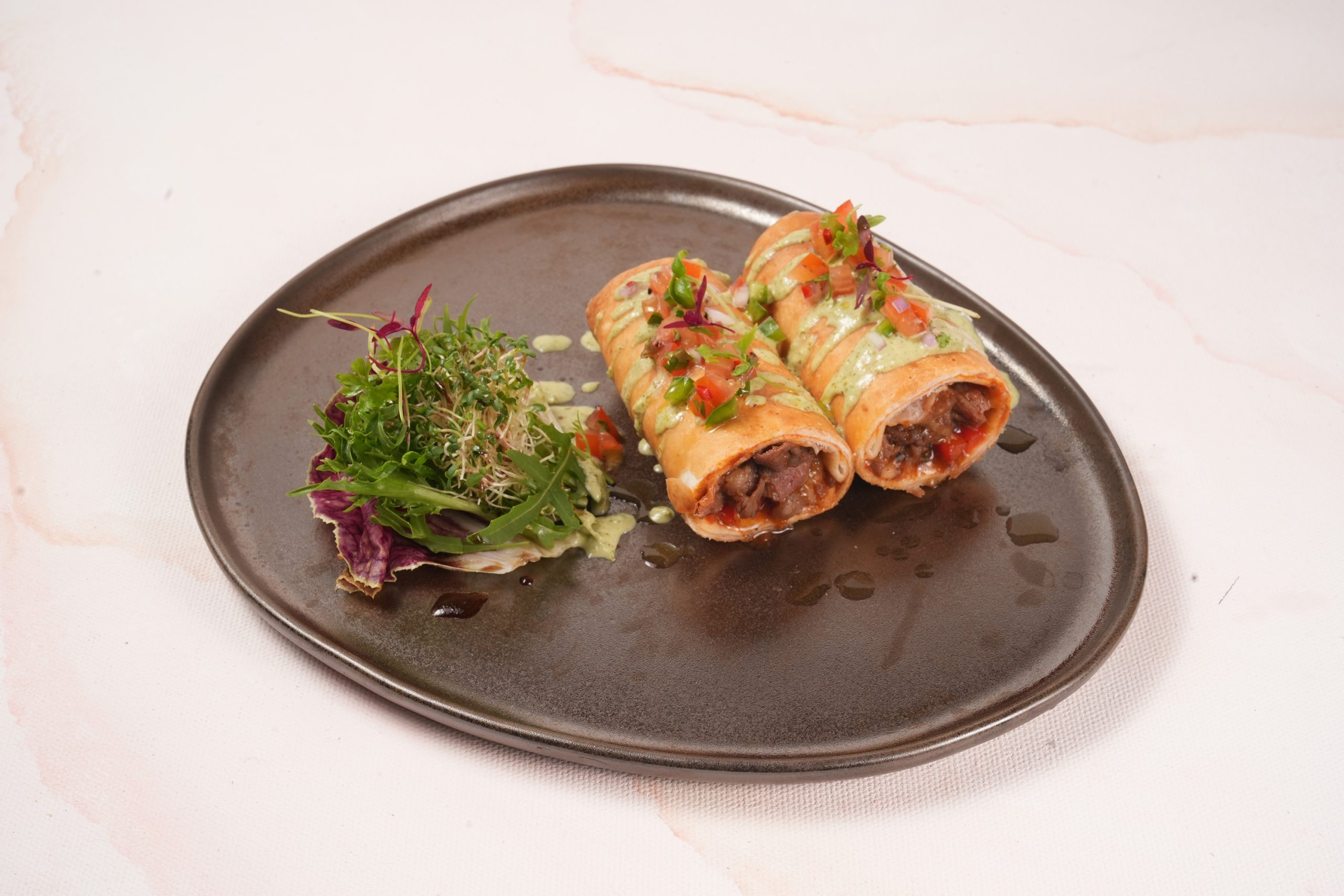 Mexican dish, featuring flour tortillas filled with BBQ ground beef & cream cheese mixtures, then rolled and baked until crispy & golden, served with toppings pico de gallo and sriracha mayo