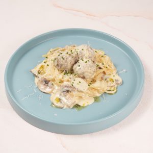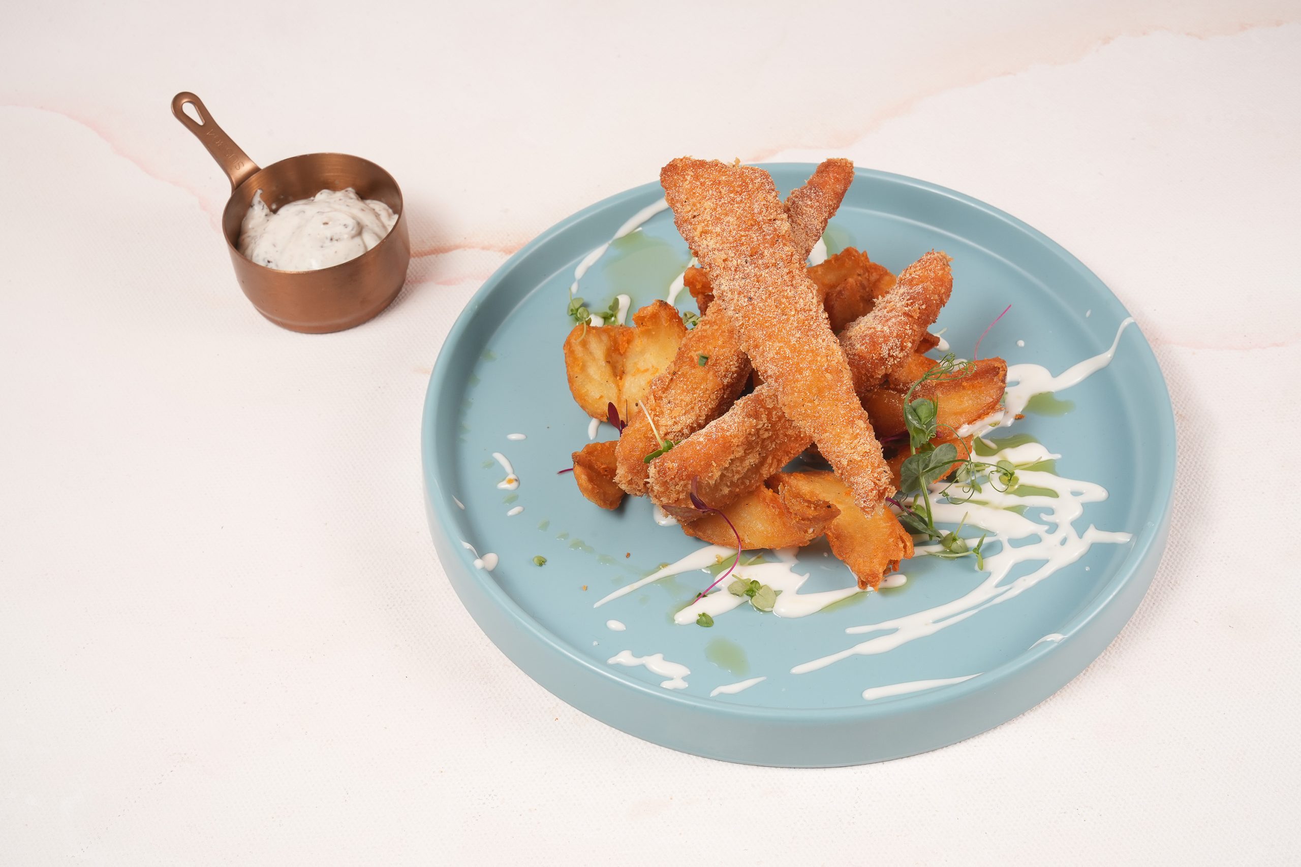 Crispy chicken fingers served with curly sidewinder chips on a mayo base, with truffle mayo on the side for extra dipping fun