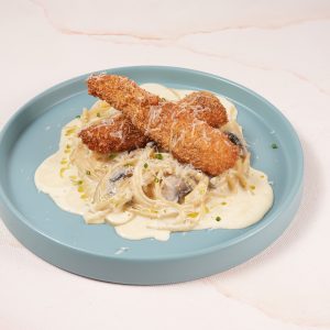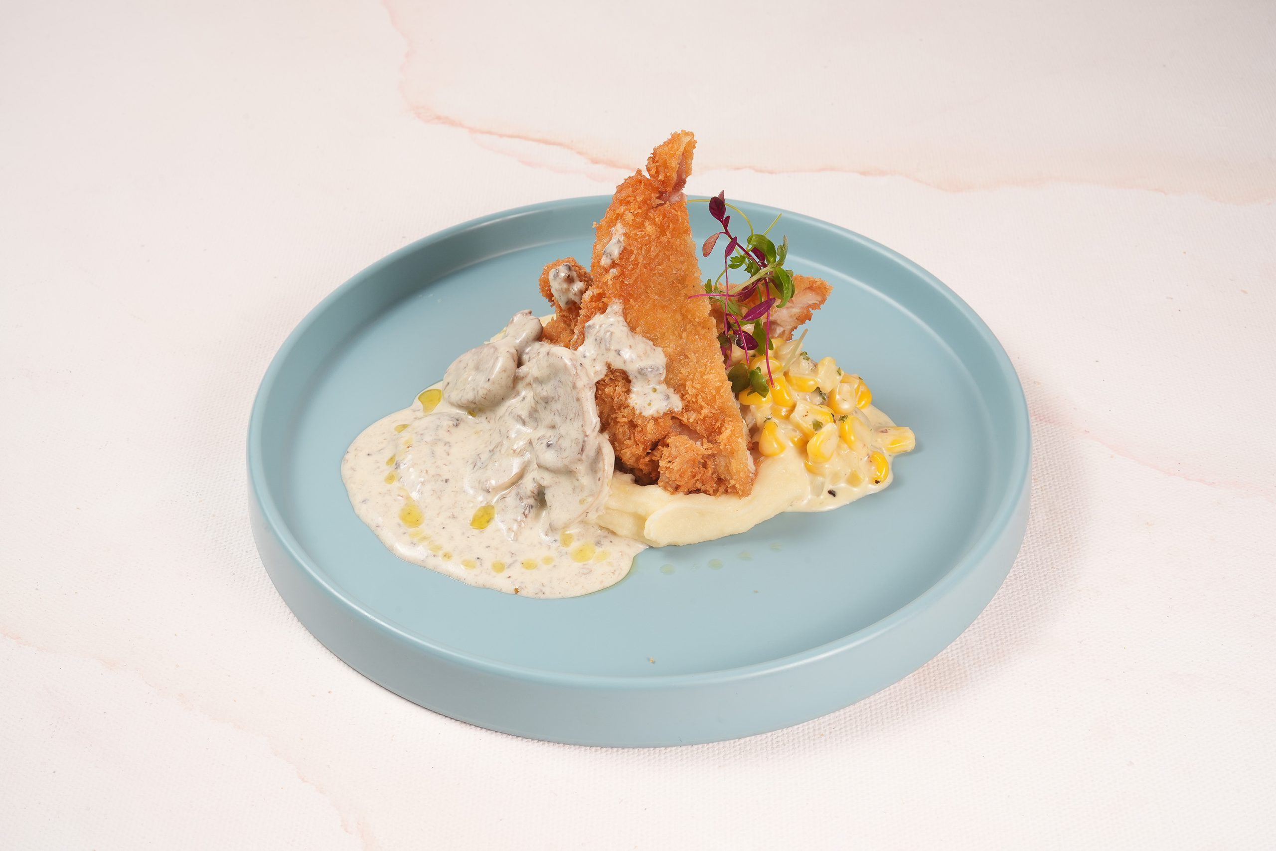Crispy boneless chicken chop served with sweet creamed corn, fluffy homemade mashed potatoes, and a drizzle of yummy truffle cream sauce