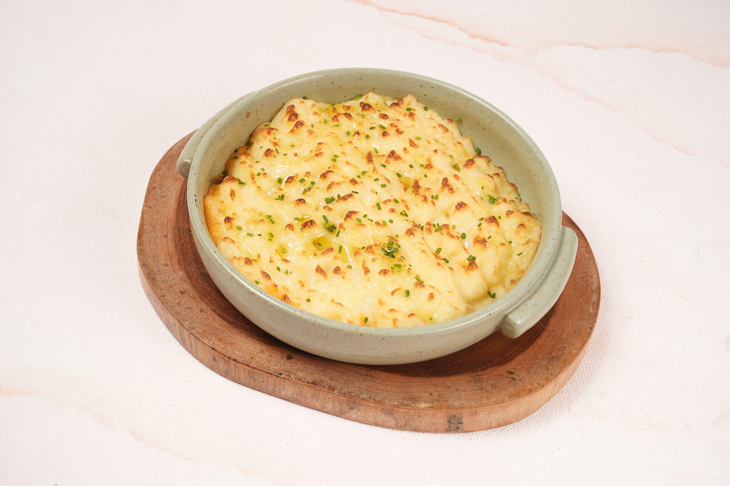 Cheesy mashed potato baked on top of smoky BBQ beef with button mushrooms, finished with parmesan cheese