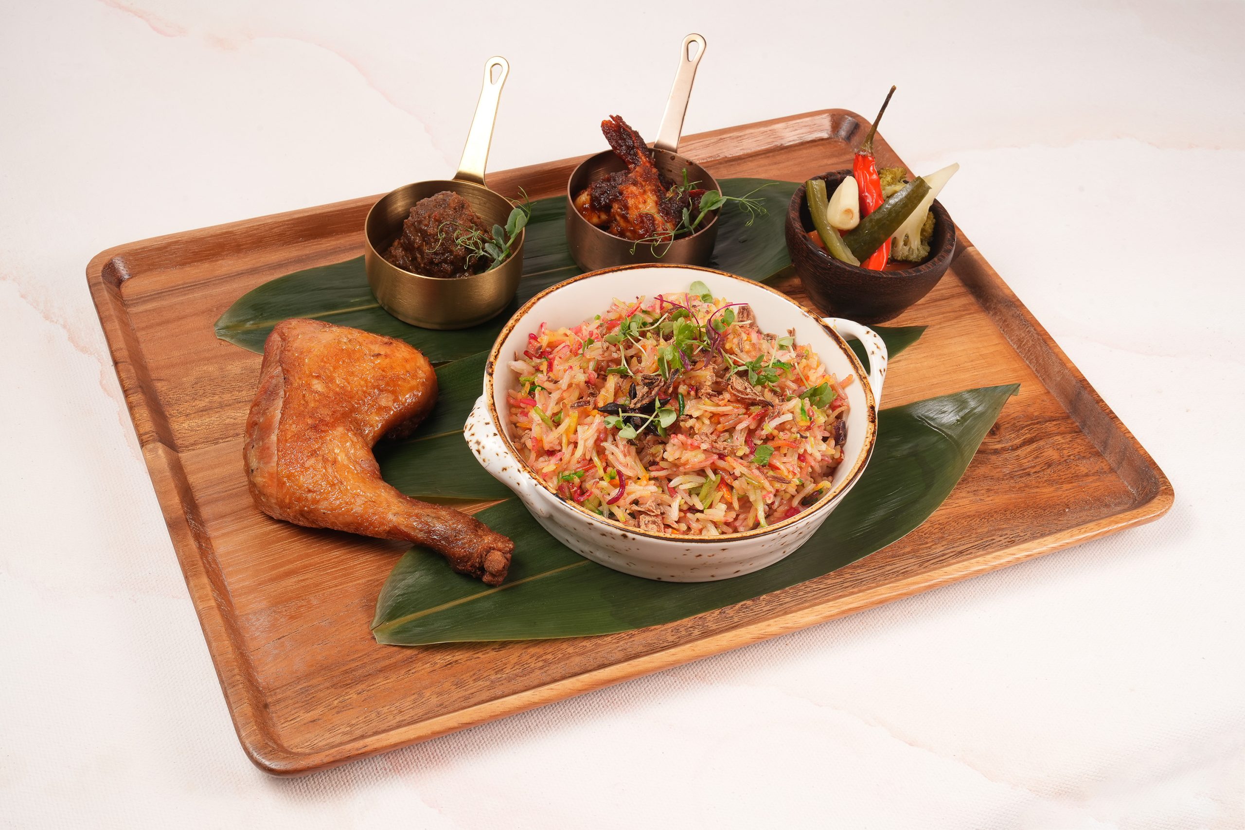 Nasi Bojari consists of tricoloured steam aromatic Basmati rice, cooked to perfection with sambal prawns and beef rendang, together with pickled vegetables & crispy fried whole chicken leg