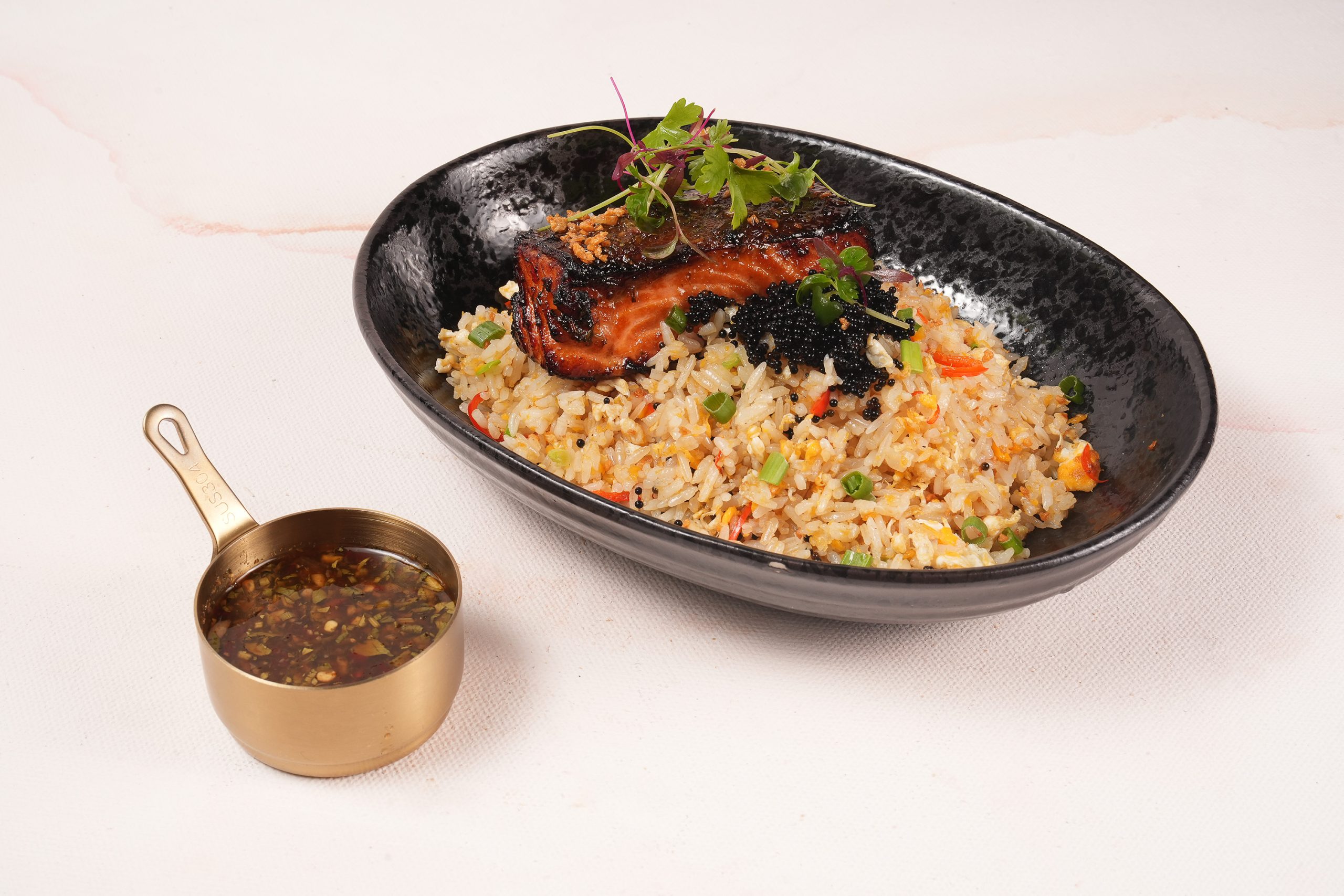 sliced scallion & julienned red chillies, served with 100g of baked salmon fillet glazed with Danok sauce & topped with black tobiko