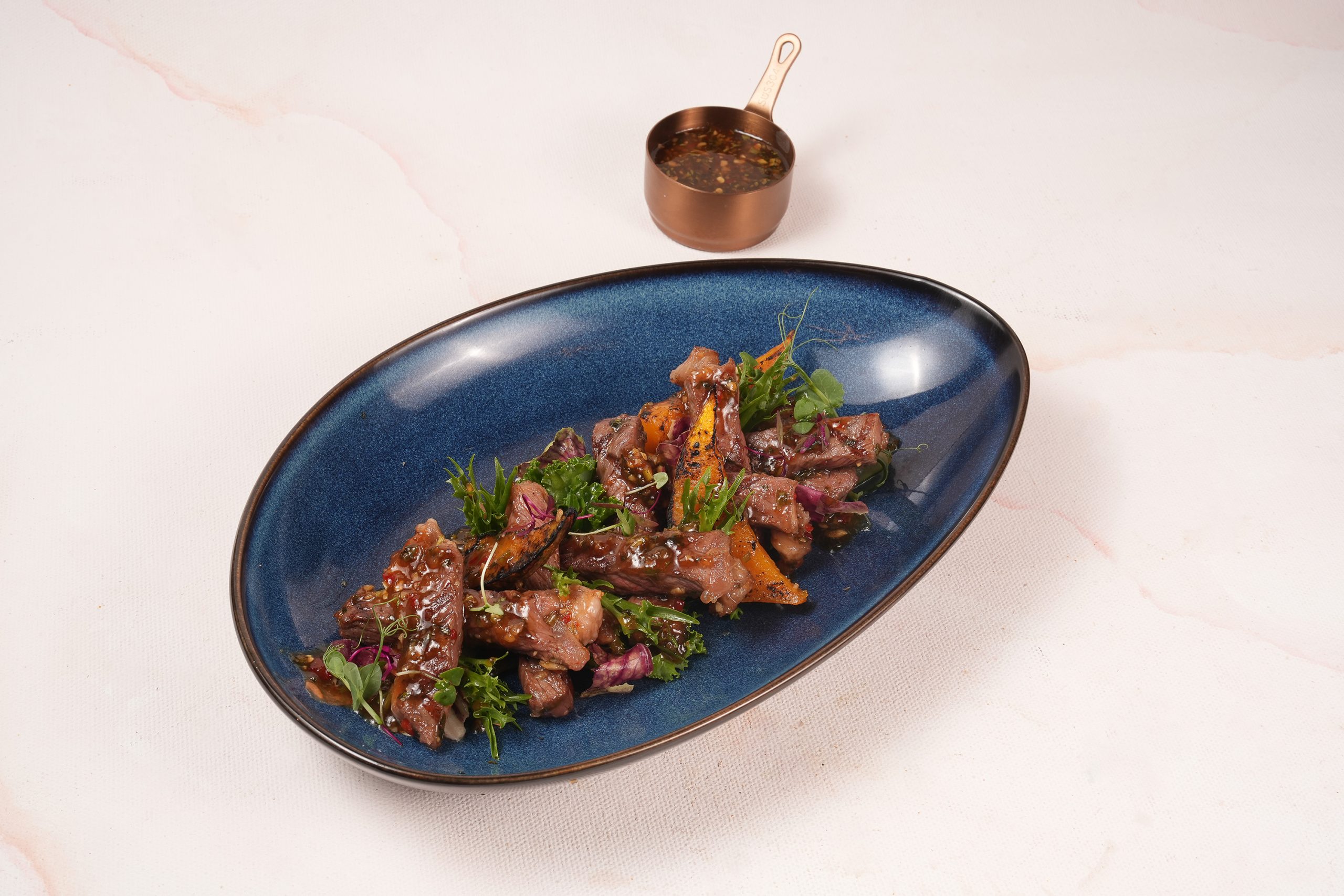 Grilled premium grain-fed striploin with Danok marination served on a bed of mixed salad, roasted pumpkin & Danok dipping sauce