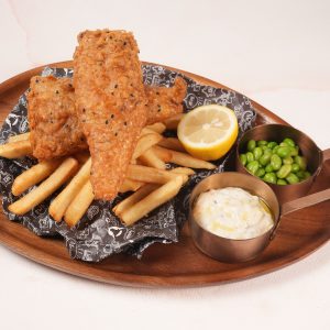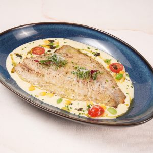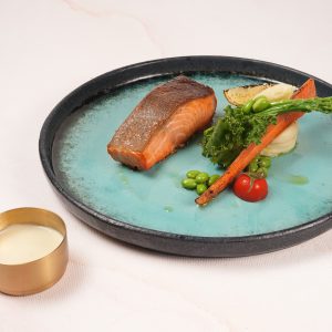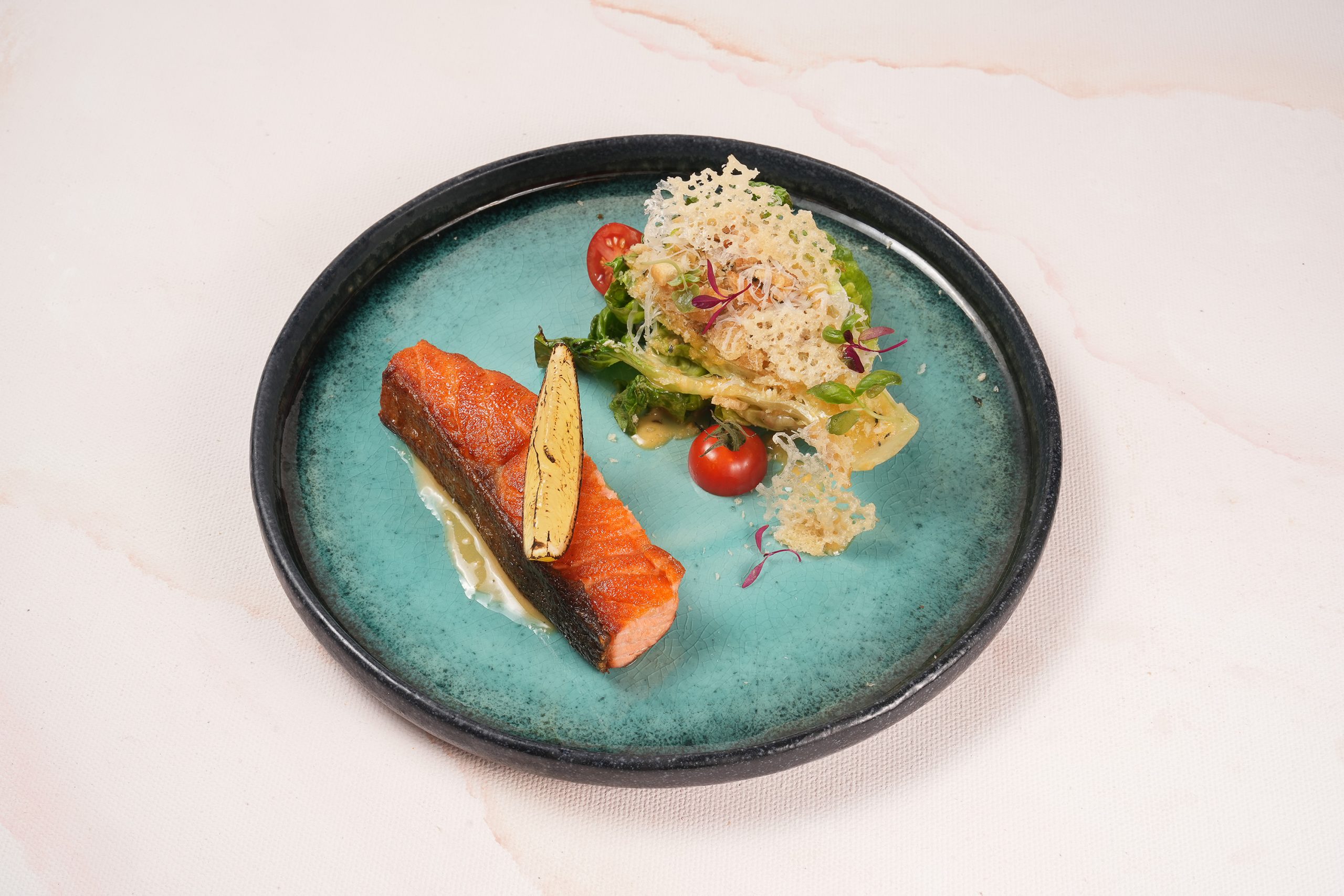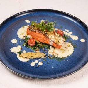 160gm baked salmon fillet served with chargrilled baby romaine, Parmigiano tuile, crumble crostini, tomato truss & Caesar dressing