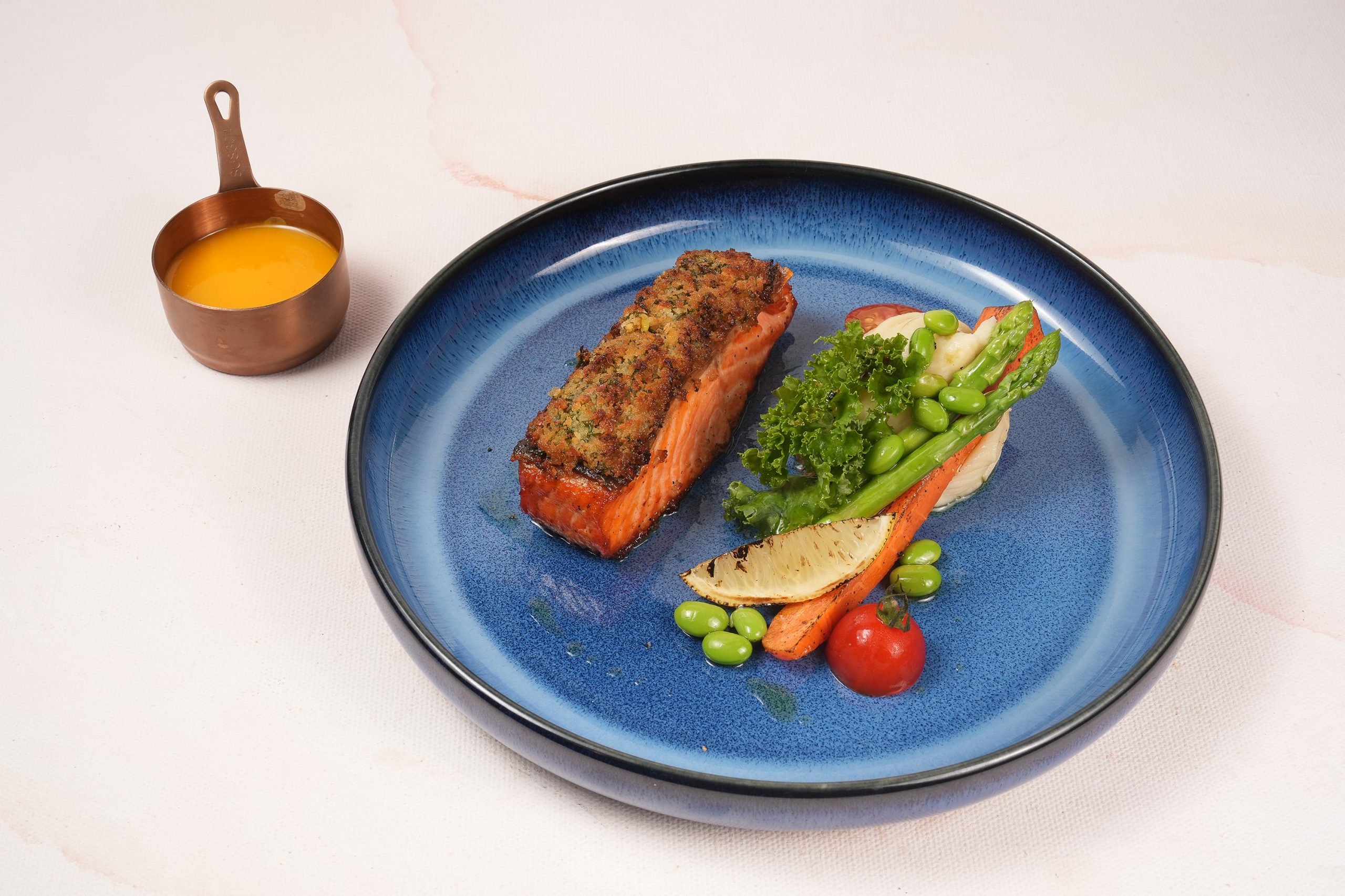 Oven-baked herb-crusted Norwegian salmon fillet, buttered vegetables, mashed potatoes served with orange butter sauce