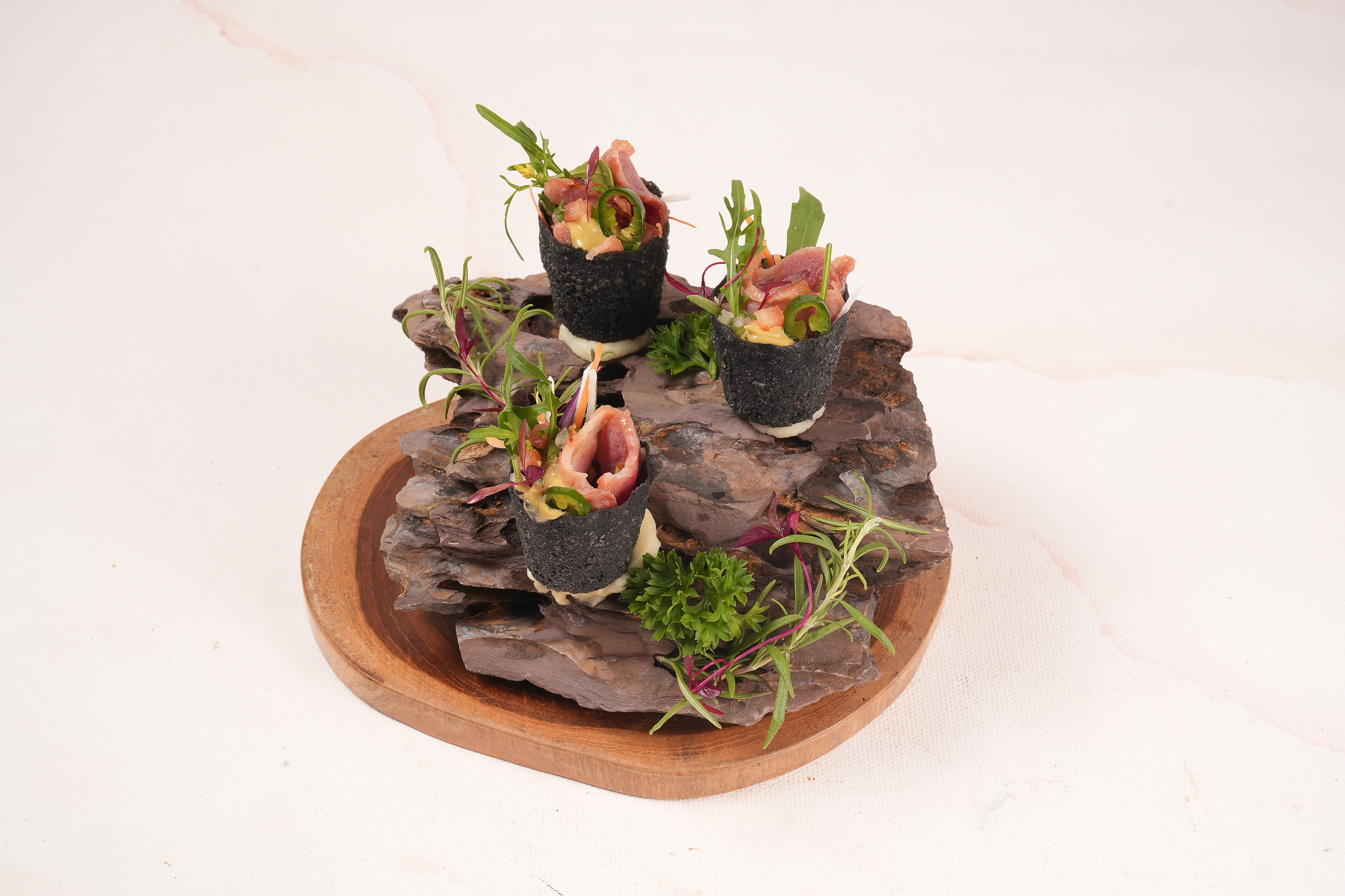 Crispy charcoal pai tee filled with smoked duck breast, creamy avocado mayo, fresh Asian slaw, and a drizzle of tangy Danok sauce